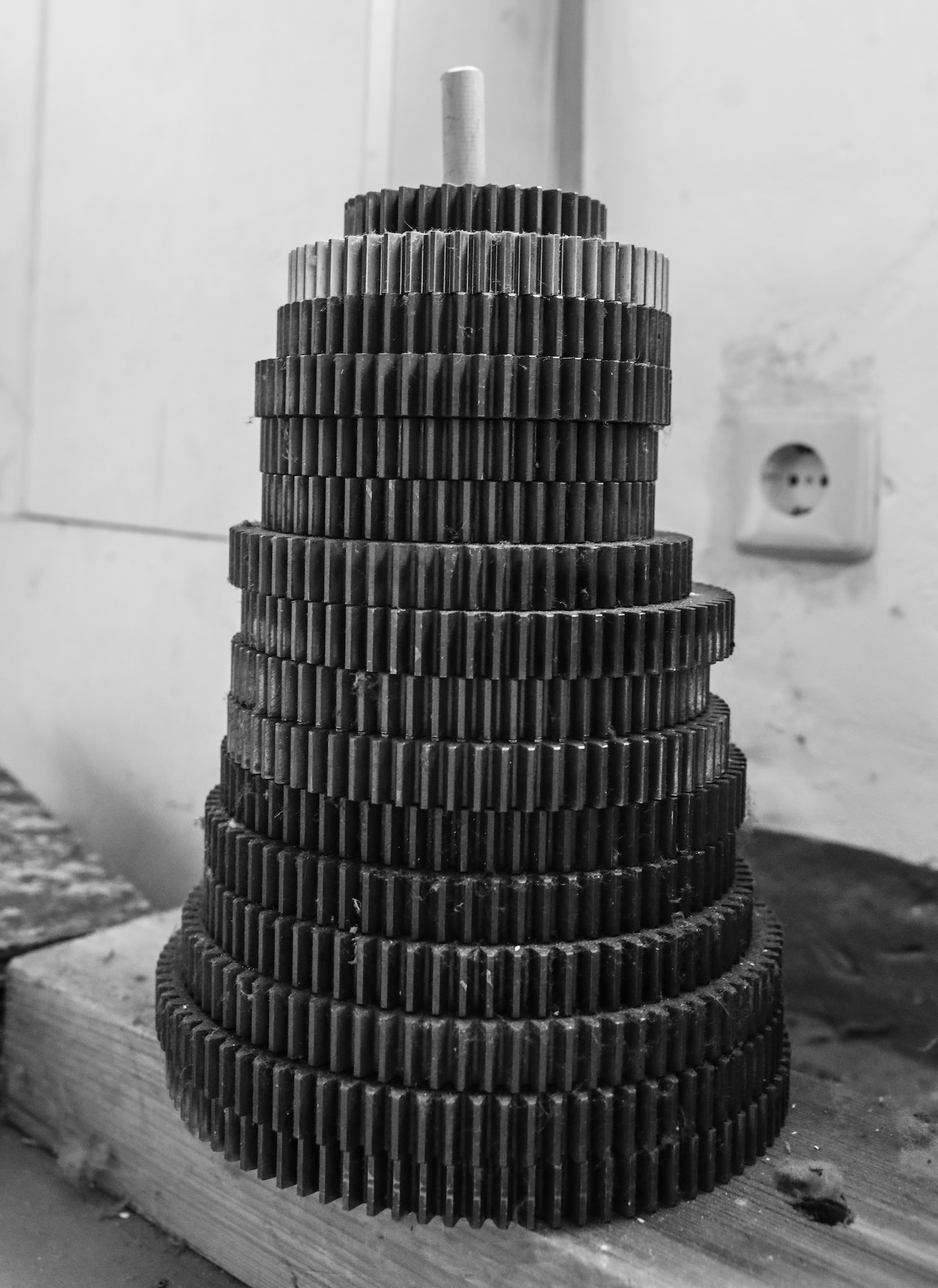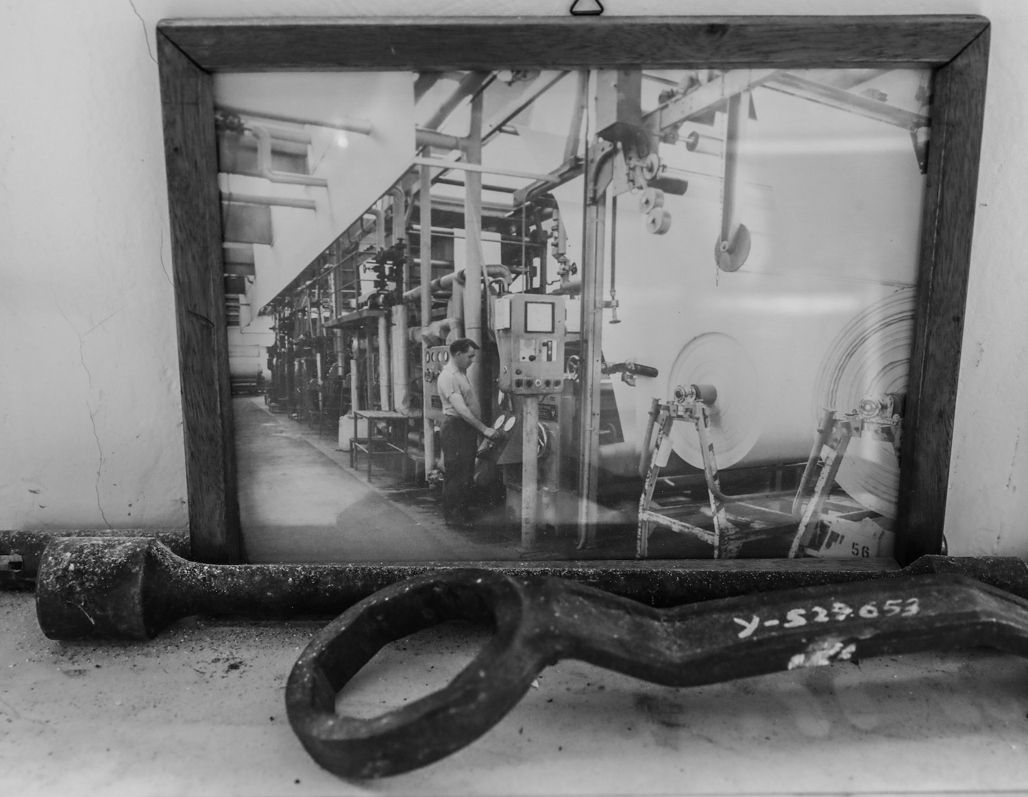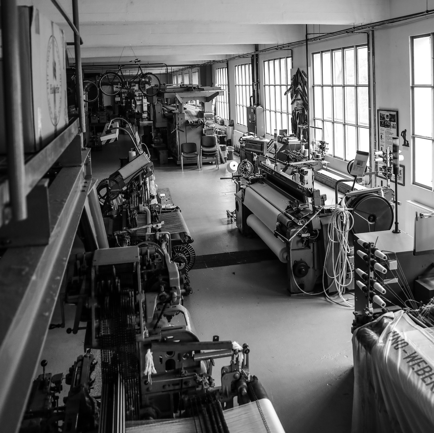 Der aus Nordhorn stammende Londoner Künstler Stefan Klimas hat einen auf über 100qm Wandfläche aufgezogenen Digitaldruck mit vergrößerten und kunstvoll ineinander geschobenen Fotografien aus der NINO-Produktion erstellt. Ein Blick auf dieses Werk lässt die enormen Ausmaße der einstigen Fabrikhallen mit ihren lang gezogenen Maschinenstraßen erahnen.